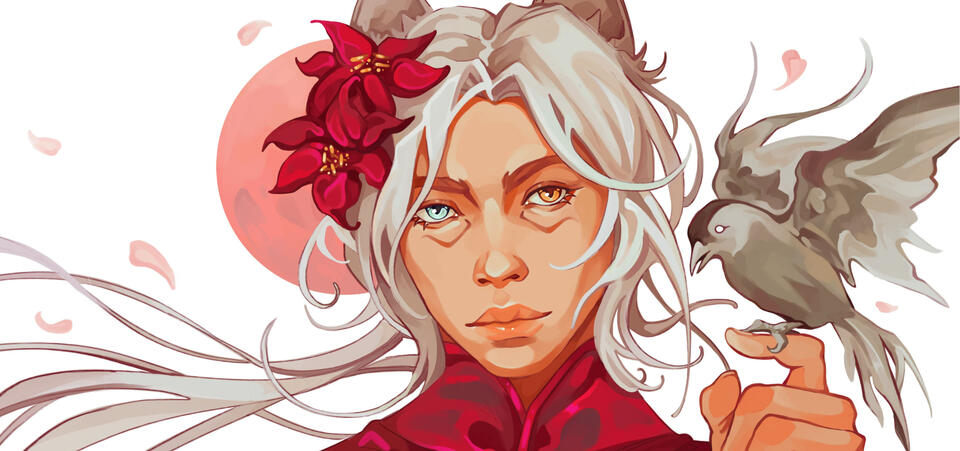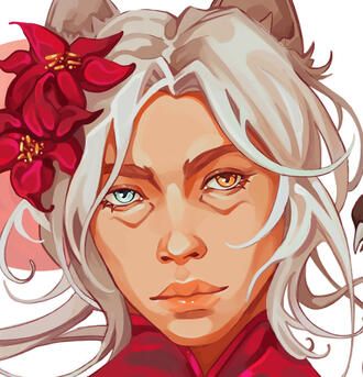 appearance. ⠀⠀ blue-gold eyes, tender and warm • sun-freckled skin, marred by old scars • flowers woven into ashen hair • fangs that peek from the corners of his smirklikes. ⠀⠀ Cursed artefacts and old ruins • sunrises and new beginnings • constellations and the first breaths of moonlight • blanket forts and little laughsdislikes. ⠀⠀ The taste of booze • long conversations • rules and expectations • the man who came before • silence, and the thoughts that accompany • the sting of violence • snowflakes in his fur